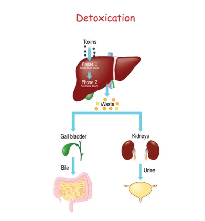 - Phase 3: Elimination In the final phase, the now neutralized toxins are transported out of the body through various elimination pathways (urine, feces, perspiration). The liver plays a central role in this process, excreting toxins into the bile, which is then released into the digestive tract and eliminated via the stool. The kidneys filter water-soluble toxins from the blood, excreting them through urine, while the lungs, skin, and lymphatic system also play important roles in removing toxins through breath, sweat, and lymphatic drainage.